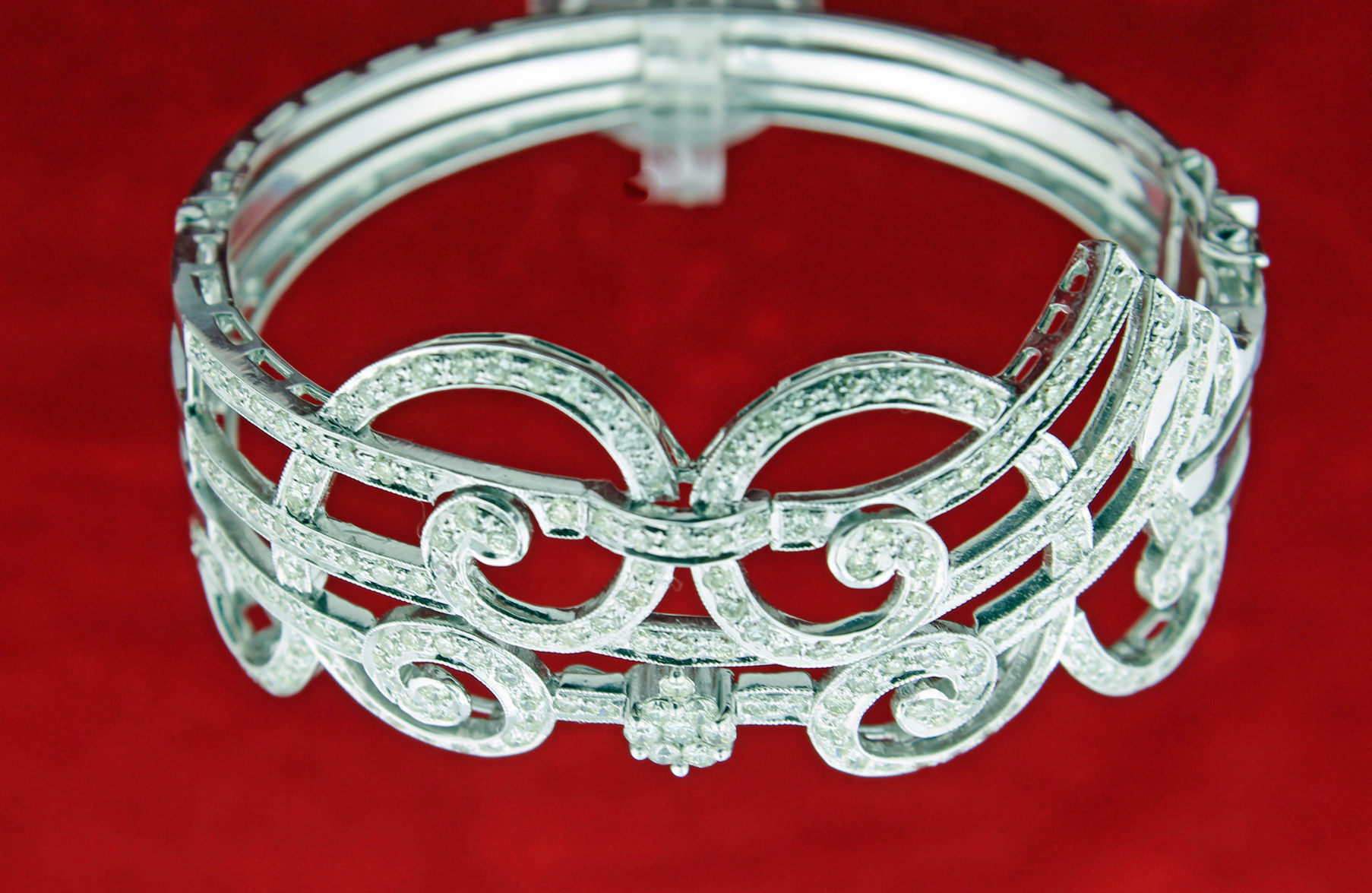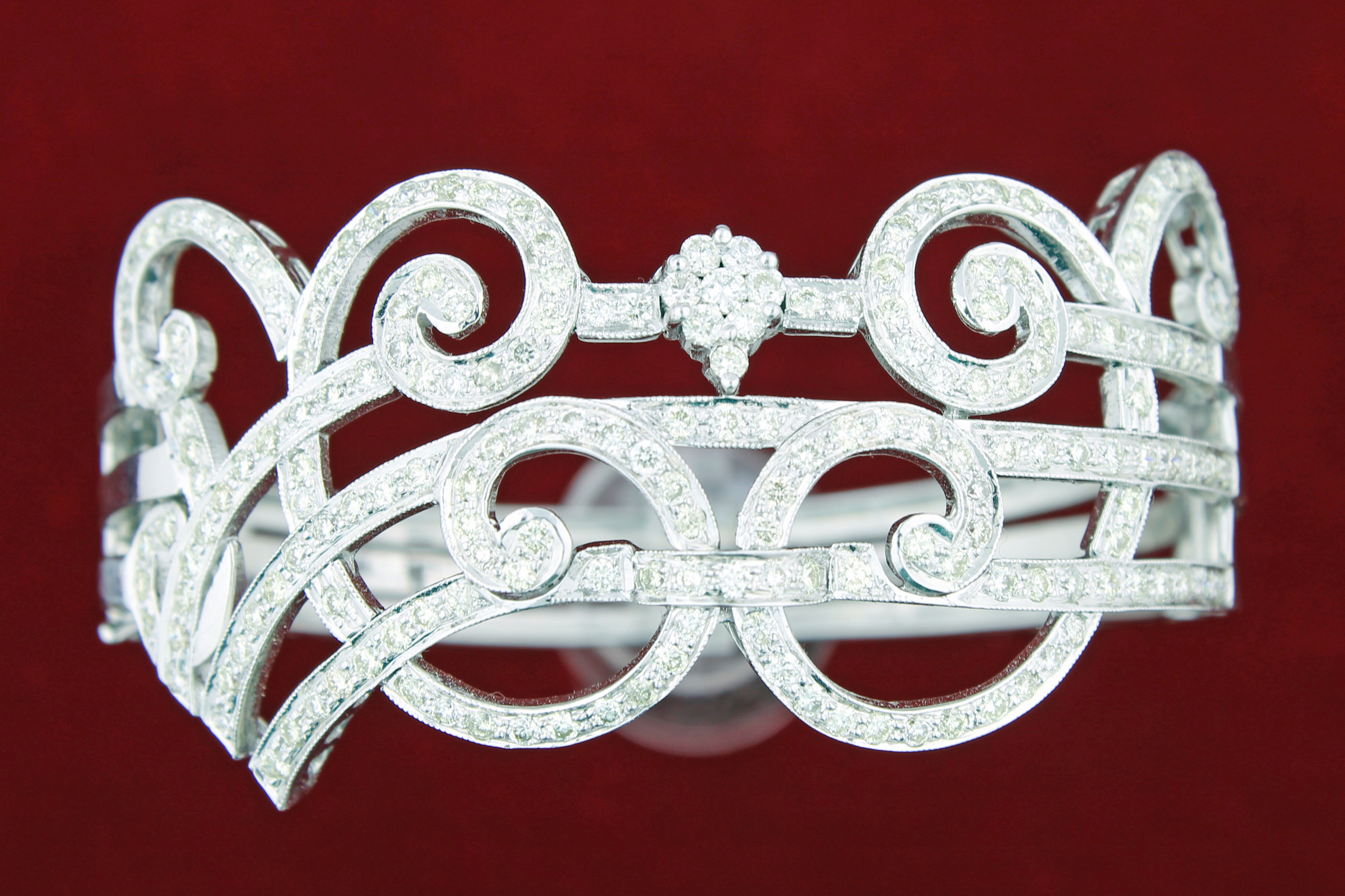 Pieces: 1Metal Purity:18KT White GoldGross Weight (Gms): 43.61Weight (Gms)NET: 42.454Stone: DiamondsDiamond Shape :Round Stone Weight(Carat):XDiamond Clarity: VS-SIDiamond Weight: 5.78
